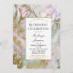 An elegant retirement party invitation featuring rich pink blue marble laced with gold and a gold frame.