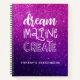 This personalised girly 8.5 x 11 sketchbook has white text on a beautiful pink and purple faux glitter background. The words, "DREAM,IMAGINE,CREATE" in a hand drawn font personalised with your name below. Customise the sketchbook with the name of your choice to make someone feel extra special. Makes a fun gift for birthdays or for Christmas. Comes in a variety of colours. Designed for you by Blackberry Boulevard.