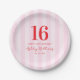 Create your own personalised 16th birthday party plates featuring modern typography and striped pink pattern background