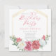 Elegant and classy pink and white rose floral with sage green greenery "Birthday Party" script text design with geometric gold-toned lines frame.