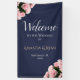 Elegant Pink Roses Bouquet Floral Wedding Welcome Banner. This modern and elegant floral wedding welcome sign features beautiful pink roses bouquet in two corners and fancy white calligraphy on a dark navy blue background. The design has an elegant border. Personalise all the text on the banner, bride and groom names and the wedding date.