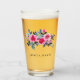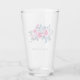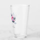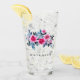 Elegant drinking glass design featuring bright pink watercolor roses, blue and grey foliage on a white background. Text can be changed.