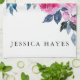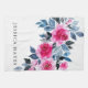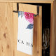 Elegant kitchen towel design featuring bright pink watercolor roses, blue and grey foliage on a white background. Text can be changed.