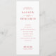 This wedding program features a minimalist and elegant design with a soft pink background and muted coral red text, creating a harmonious contrast. The layout is clean and structured, utilizing classic serif typography to convey sophistication and formality. Perfect for weddings, it includes customizable sections for the ceremony details, ensuring clarity and readability while maintaining a refined aesthetic. The overall mood is one of understated elegance, making it ideal for couples seeking a timeless and stylish invitation.