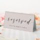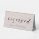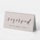 Custom-designed wedding reserved table sign featuring modern hand calligraphy with personalised text on dusty pink colour background.