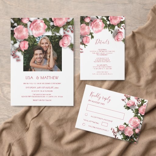 Step into the future of wedding invitations with this stunning wild roses floral 3D design with your photo. The delicate, lifelike pink flowers create a captivating visual that almost feels like you can reach out and touch them. The intricate, three-dimensional effect adds a layer of depth and elegance that’s truly one-of-a-kind. The modern, stylish font perfectly complements the design, creating a sophisticated and fresh look.