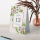 Beautiful wedding number table tent design featuring pink and white watercolor flowers and green foliage.