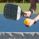 Monogram Script Name Plaid green and purple check pickleball paddle that you can easily add your name and initial by clicking the "Personalise" button. Perfect for an amateur or veteran player