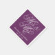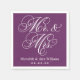 Wedding napkins feature "Mr. & Mrs." in a white calligraphy script font with custom monogram design that can be personalised with the bride and groom's married name and wedding date. Plum purple and white colour scheme.