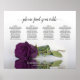 This beautiful seating chart has table assignments for 40 guests at 4 tables - 10 people per table. The design is elegant, sophisticated, romantic & chic, with a single plum purple or eggplant coloured rose reflecting in water. The title reads "please find your table" in lacy script calligraphy, and there is space for the names of the couple and the wedding date. Great way to make your reception beautiful while making it easy for your guests to find their tables.