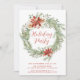 Elegant floral Christmas party invitations featuring "Holiday Party" in a red script encircled by a wreath of red watercolor poinsettias, cream roses, pine boughs, holly berries, and other winter greenery. Personalise the rustic poinsettia invitations with your party details displayed below in red lettering.