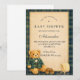 A charming preppy baby shower design featuring a sweet teddy bear dressed in a classic green plaid jacket and bow tie. Above the bear, a delicate clothesline displays tiny baby clothes and shoes, creating a nostalgic storybook nursery scene. The deep navy background and subtle tartan border add a refined, vintage-inspired touch that feels both elegant and playful. Perfect for a stylish baby shower celebration with a classic preppy aesthetic.