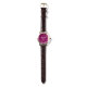 An elegant and festive wristwatch, with the words 'Merry & Bright' repeated around the edge in elegant script typography. The text is white, on a rich blackcurrant magenta face. Personalise this stylish watch with your name or other text for an individual finishing touch.