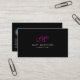 Your monogram letter appears in an elegantly simple script font in the middle of this business card design. Below it is your name and title. All these elements appears strikingly bold over a jet black background. Perfect for elegant, professional, simple, consultant,business, artistic, design themese, but generic enough to be used as a business card for almost any business or industry.