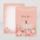 An elegant, autumn pumpkin with florals in pink, coral and yellow. String lights above and "Thank You" script on blush pink background.