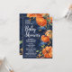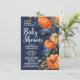 Elegant and classy watercolor art style baby shower invitation with orange pumpkins on dark navy blue background. Invite guests to a halloween, fall autumn harvest pumpkin themed baby shower for boy or any child with this beautiful modern custom printed invitation. Stylish custom generative ai graphics with your personalised baby shower event party details.