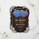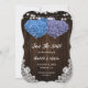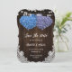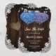 Romantic rustic purple and blue wedding save the date cards featuring white floral lace, string lights and floral hearts against a barn wood background. Matching items available.