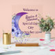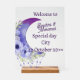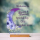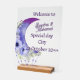 Welcome your guests with this stunning acrylic wedding sign featuring a dreamy purple crescent moon and floral design. Personalised with the couple's names, date, and city, it sets a romantic tone for your special day. The transparent acrylic and wooden base make it a stylish and modern piece perfect for receptions, ceremonies, or entrance tables.