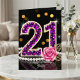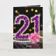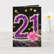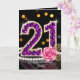 Celebrate her special milestone in style with this luxurious 21st birthday greeting card. Perfect for the young woman who loves a touch of glamour, this artwork features a dazzling "21" filled with faux purple diamond gemstones and trimmed in gold. The sophisticated composition is accented by a classic string of white pearls, gold filigree leaves, and a soft pink rose against a sleek black background with festive bokeh lights.
