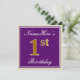 This simple and elegant birthday party invitation design features a personalised message like "NameHere’s 1st Birthday" (with the "1st" having a faux/imitation gold-like colouring look) within a purple-coloured square area featuring a simple border outline. The name is in an elegant white-coloured script-like text, and can be customised. The back features customisable invitation details. A birthday party invitation like this could perhaps be used when inviting people to a birthday party being held for somebody who is celebrating their first birthday. [~Z0000226]