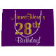 This simple, elegant birthday gift bag design features a personalised message like "NameHere’s 28th Birthday!" (with the "28th" having a faux/imitation gold-like colouring look) on a purple coloured background. The name is in script-like, yellow-coloured text, and can be customised. A personalised birthday themed gift bag like this could perhaps be used when giving a present or gift to somebody who is celebrating their twenty eighth birthday. [~Z0000255]