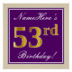 This simple and elegant birthday party poster design features a personalised message like "NameHere’s 53rd Birthday!" (with the "53rd" having a faux/imitation gold-like colouring look) within a purple-coloured square area featuring a simple border outline. The name is in an elegant white-coloured script-like text, and can be customised. A personalised birthday party poster like this could perhaps be used as a decoration at a party being held for somebody who is celebrating their fifty third birthday. [~Z0000238]