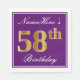 This simple and elegant paper napkin design features a message like "NameHere’s 58th Birthday" (with the "58th" having a faux gold-like colouring look) within a purple-coloured square area featuring a simple border outline. The name is in a white-coloured script-like text, and can be customised. Napkins like these could perhaps be used at a birthday party for somebody who is celebrating their fifty eighth birthday. [~Z0000140]