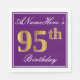 This simple and elegant paper napkin design features a message like "ANameHere’s 95th Birthday" (with the "95th" having a faux gold-like colouring) within a purple-coloured square area featuring a simple border outline. The name is in a white-coloured script-like text, and can be customised. Napkins like these could perhaps be used at a birthday party for somebody who is celebrating their ninety fifth birthday. [~Z0000140]