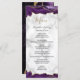 This elegant, modern wedding menu features top and bottom borders of purple watercolor agate trimmed with gold faux glitter. The text appears in elegant gold-coloured handwriting script and black italic and copperplate fonts on a grey and white marble background. The agate design is repeated on the reverse.