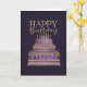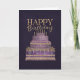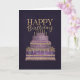 A luxurious birthday card featuring an intricately decorated purple and gold tiered cake set against a rich, dark background. With ornate details, jewel-like accents, and elegant “Happy Birthday” lettering, this design creates a regal and sophisticated look—perfect for celebrating in style.
