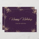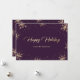 Elegant purple and gold holiday cards featuring snowflakes and snow on a purple background. A beautiful script font with a gold foil effect in the centre. Easily personalise these purple and gold snowflake holiday cards with your family name and message.