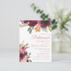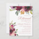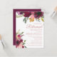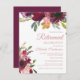 Beautiful and elegant plum purple and pink floral and sage green leaves botanical watercolor retirement party invitation on a white background. Text is gold calligraphy brush font and is aligned on the right side of the card.