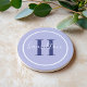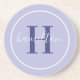 An elegant sandstone coaster featuring a royal purple serif initial and custom family name in script, framed by a white circle on a soft lavender background. The regal purple tones create a unique, eye-catching accent for any tabletop. A striking personalised gift for housewarmings, birthdays, or purple decor enthusiasts. All text is fully customisable.