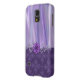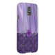 Pretty purple Samsung Galaxy S5 case with graphics of a satin looking background, on the top part of the case, and a purple on purple damask, on the bottom. Elegant graphics of a lavender flourishes and a purple flower decorate across the case between the two background patterns. Customise to add text. The perfect way to protect your electronic device and look stylish too.