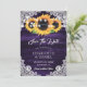 Purple and sunflower wedding save the date card featuring sunflowers on a rustic wood background adorned with elegant floral lace, burlap hearts and string lights. Matching items available.