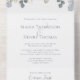 Featuring a QR code elegant rsvp online wedding invitation with a light dusty blue floral flower, a simple all in one trifold, on a budget classic modern, with guest reply via website web, classy modern minimal, a stylish calligraphy script ampersand, traditional classic classy budget, a minimalist greenery foliage leaves leaf, a response reply web address