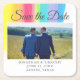 Beautiful rainbow wedding Save the Date coaster with pretty, artistic paint strokes full of bright colour above your LGBT engagement photo. These colourful coasters are perfect for an artistic couple or a gay and lesbian wedding.