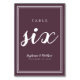 This design was created for smaller intimate wedding celebrations. Simple, minimalist and elegant Wedding Table Number SIX design features a contemporary design with a double frame border in crisp white on a CASSIS purple background. The design is chic and timeless. Personalise wedding table design with your wedding details in crisp white lettering and script. The back of the card is a duplicate of the front. Order one for every table with the individual table numbers.