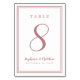 A template for any number this simple, minimalist and elegant Wedding Table Number design features a contemporary design with a double frame border in romantic dusty rose on a crisp white background. Chic design provides timeless yet modern sophistication. Personalise wedding table design with your name, wedding date and table number in pink lettering and script. The back of the card is a duplicate of the front. Easily customise and order one for every table with the individual table numbers.