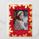 Elegant foil holiday card featuring your vertical photo framed by gold foil pine boughs with a red background. Personalise the foil pine branch holiday card with a custom greeting, the year, and your family name. The card reverses to display your custom message in white lettering.