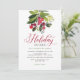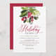 Festive holiday soirée party invitation design features a watercolor Christmas floral mistletoe ball with elegant deep ruby red script and custom text that can be fully personalised. Back of card includes a red background background with white polka dots pattern. Red, green, and soft black colour scheme.