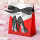 Red and black favour boxes with elegant black and silver high heel shoes on a beautiful red and silver background. This elegant red and black high heel shoe party favour box has text on the front flap and underneath the flap.