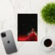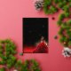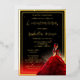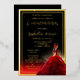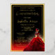 Beautiful 3D girl in red ball gown backlit with a brilliant gold sepia-toned starburst and vibrant red faux glitter with a starry sparkle black and gold background design. Real gold foil text and accents. Composite design by Holiday Hearts Designs.
