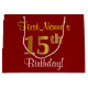 This simple, elegant birthday gift bag design features a personalised message like "FirstName’s 15th Birthday!" (with the "15th" having a faux/imitation gold-like colouring look) on a red coloured background. The name is in script-like, yellow-coloured text, and can be customised. A personalised birthday gift bag like this could perhaps be used when giving a present or gift to somebody who is celebrating their fifteenth birthday. [~Z0000253]