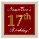This simple and elegant birthday party poster design features a personalised message like "NameHere’s 17th Birthday!" (with the "17th" having a faux/imitation gold-like colouring look) within a red-coloured square area featuring a simple border outline. The name is in an elegant white-coloured script-like text, and can be customised. A personalised birthday party poster like this could perhaps be used as a decoration at a party being held for somebody who is celebrating their seventeenth birthday. [~Z0000234]