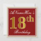 This simple and elegant birthday party invitation design features a personalised message like "ANameHere’s 18th Birthday" (with the "18th" having a faux/imitation gold-like colouring look) within a red-coloured square area featuring a simple border outline. The name is in an elegant white-coloured script-like text, and can be customised. The back features customisable invitation details. A birthday party invitation like this could perhaps be used when inviting people to a birthday party being held for somebody who is celebrating their eighteenth birthday. [~Z0000227]