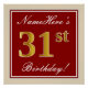 Elegant, Red, Faux Gold 31st Birthday; Custom Name Poster
