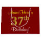 This simple, elegant birthday gift bag design features a personalised message like "NameHere’s 37th Birthday!" (with the "37th" having a faux/imitation gold-like colouring look) on a red coloured background. The name is in script-like, yellow-coloured text, and can be personalised. A personalised birthday gift bag like this could perhaps be used when giving a present or gift to somebody who is celebrating their thirty seventh birthday. [~Z0000253]