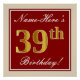 This simple and elegant birthday party poster design features a personalised message like "Name-Here’s 39th Birthday!" (with the "39th" having a faux/imitation gold-like colouring look) within a red-coloured square area featuring a simple border outline. The name is in an elegant white-coloured script-like text, and can be customised. A personalised birthday party poster like this could perhaps be used as a decoration at a party being held for somebody who is celebrating their thirty ninth birthday. [~Z0000234]