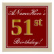 This simple and elegant birthday party poster design features a personalised message like "ANameHere’s 51st Birthday!" (with the "51st" having a faux/imitation gold-like colouring look) within a red-coloured square area featuring a simple border outline. The name is in an elegant white-coloured script-like text, and can be personalised. A personalised birthday party poster like this could perhaps be used as a decoration at a party being held for somebody who is celebrating their fifty first birthday. [~Z0000234]